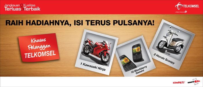 - Hadiah yang disediakan oleh telkomsel adalah 1 Buah Motor Ninja 250R dan 2 Buah Motor Honda Scoopy, dan 10 Buah Blackberry Gemini